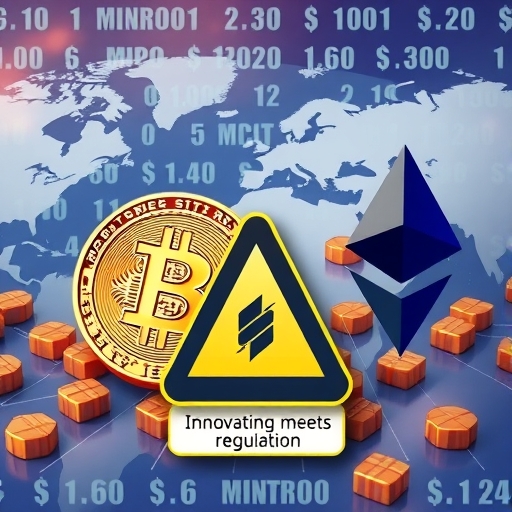 數位資產如比特幣和以太幣的插圖,背景為全球金融系統與IMF對新興市場風險的警告圖標,展現創新與監管的交會