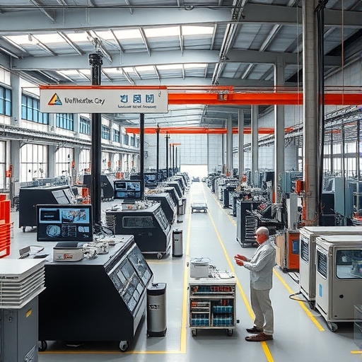 一座現代化的工廠內部,有先進的自動化設備運作