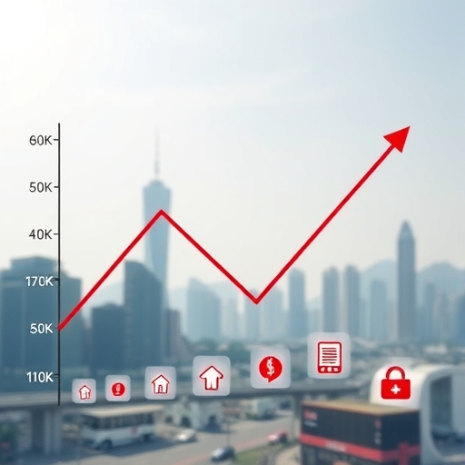上升的房租標誌、醫療十字和旅行行李箱,代表住房、醫療保健和娛樂服務價格持續上漲,反映整體緩解中頑固的通膨
