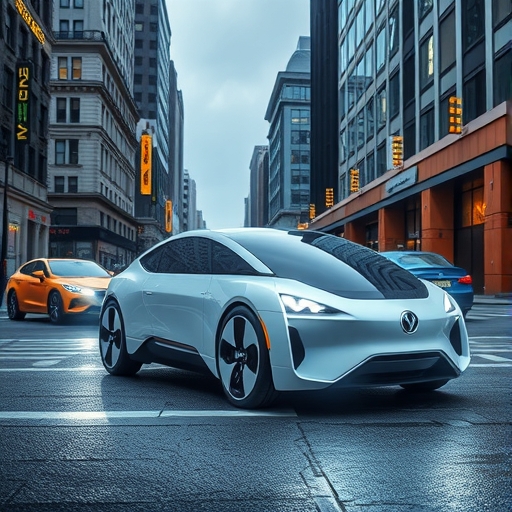 未來感的自動駕駛汽車在城市中行駛
